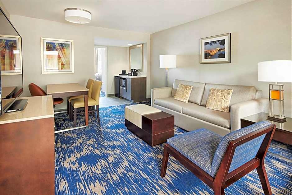 This suite features a living room with a table and sofa bed.